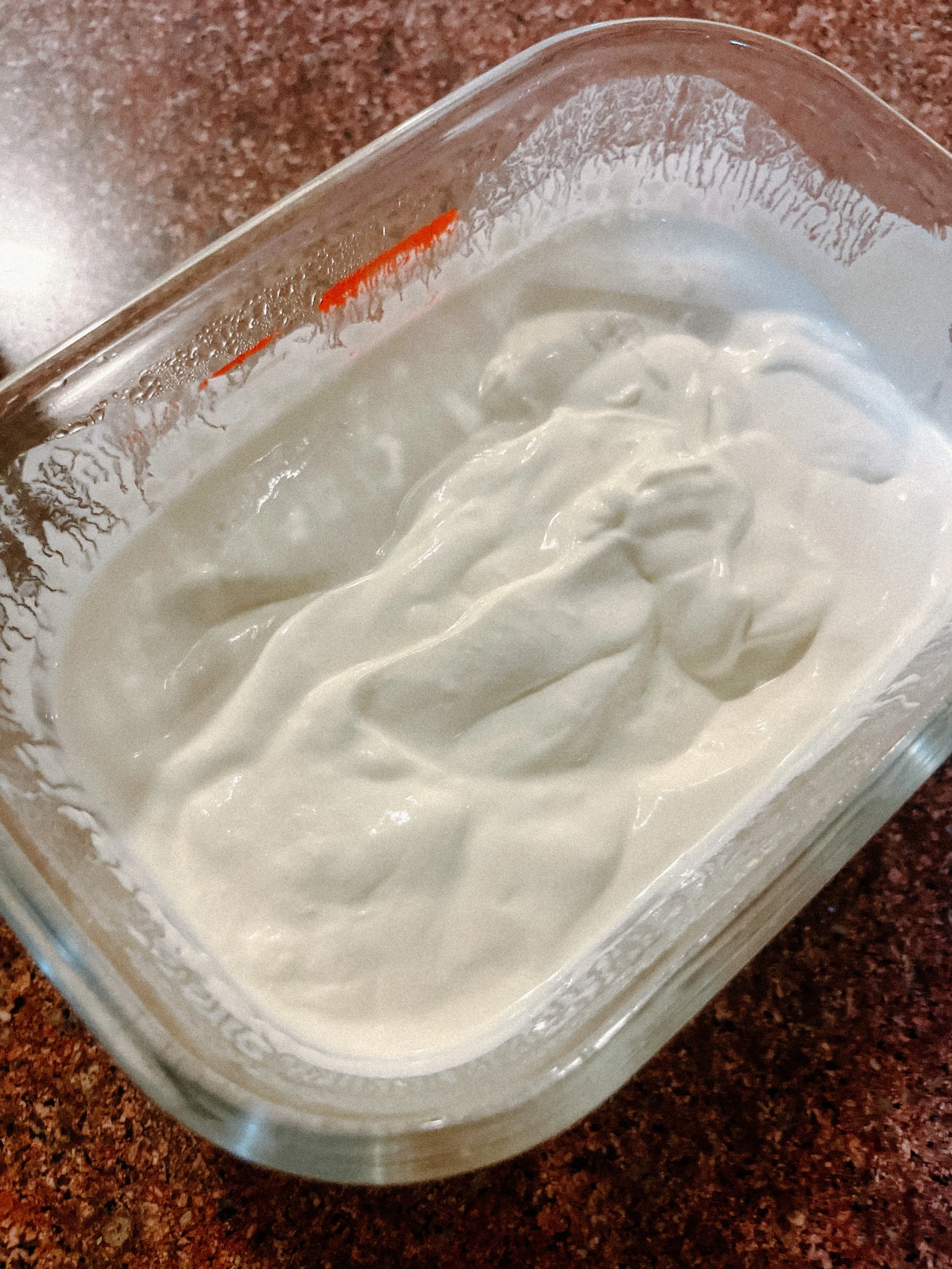 To the cream, add one tablespoon of cold curd and stir. Cover and let sit on your counter for 4-6 hours, until firm (this will vary depending on your home’s temperature). Once firm, refrigerate until cold (about 2-3 hours).