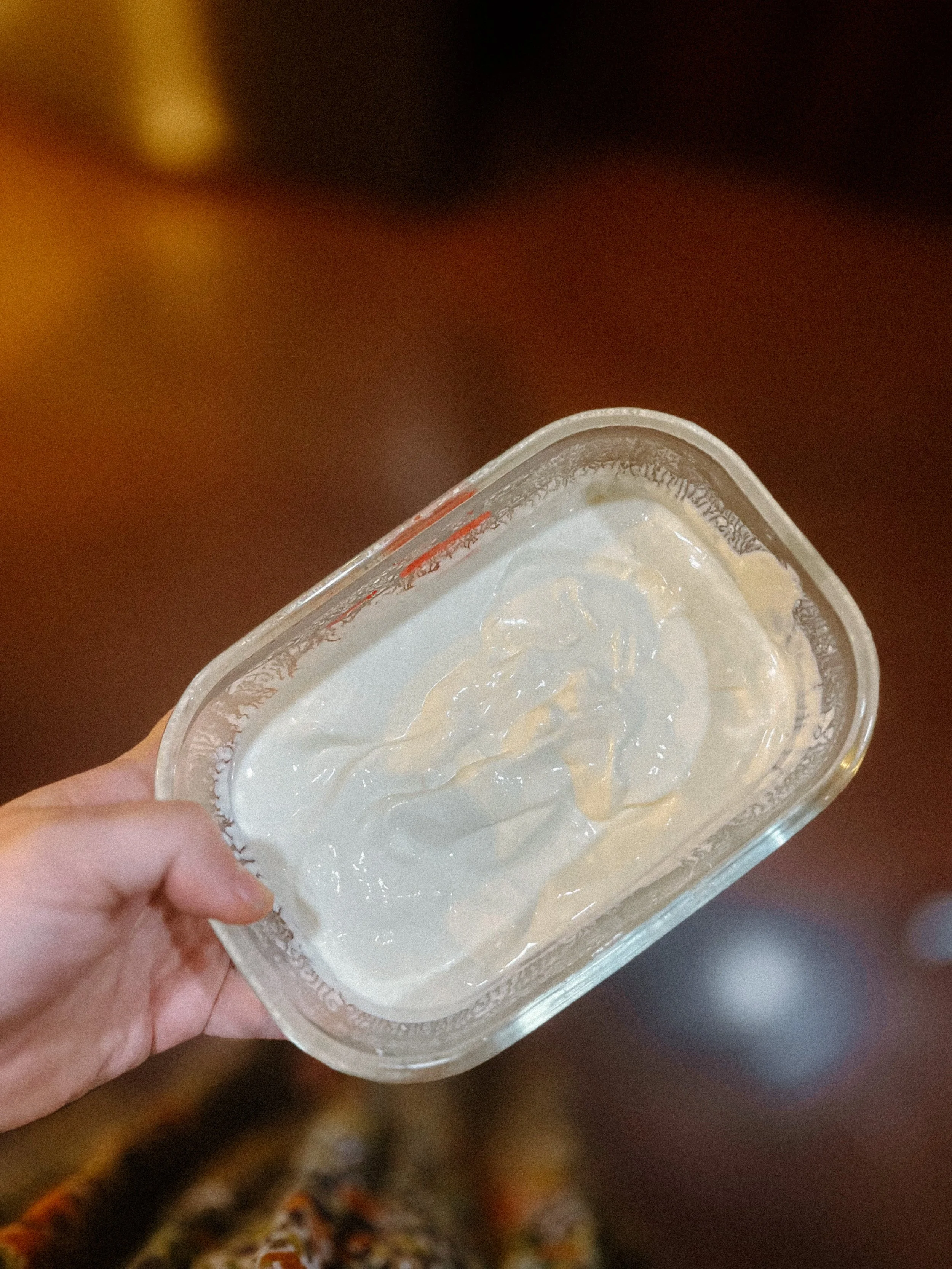 ** If your dahi is old, this method will make the cream taste incredibly sour, or might not even set up properly. If making this in America, just use one tablespoon of plain yogurt.