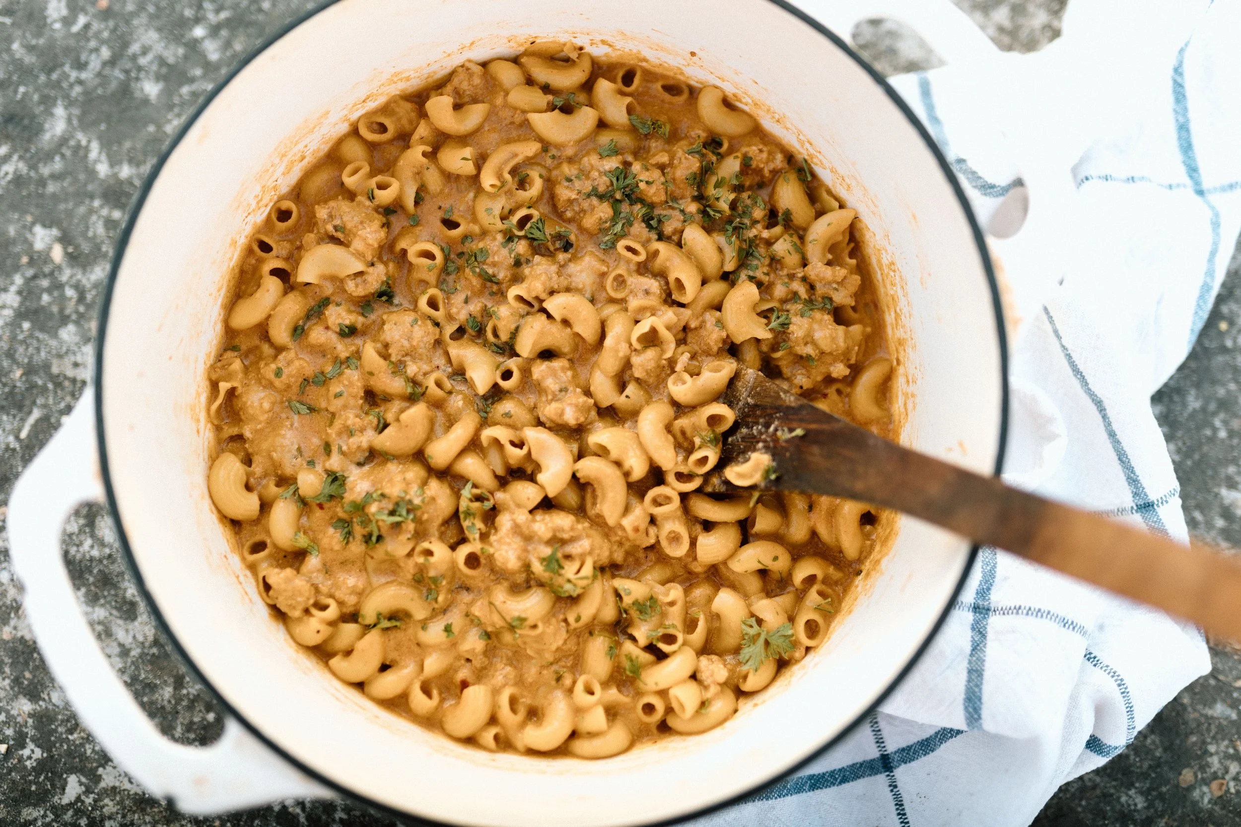 I’m really, really proud of this recipe. It’s got all the hallmarks of deliciousness with a ton of ease thrown in — it’s one pot, takes about 30 minutes total, packed full of flavor — and the best part for those of you South Asian dwellers: IT’S BEEFLESS BUT DOESN’T TASTE LIKE IT. Okay, it has beef flavoring which is essential, BUT you don’t have to have actual ground buffalo or beef to make this. Believe it or not, it’s ground chicken. Brodie Ellis (the husband) is one of my biggest critics. He rarely tells me anything I make is good (even if he enjoys it), and he (quite honestly) rarely asks for seconds. This recipe? He INHALES.